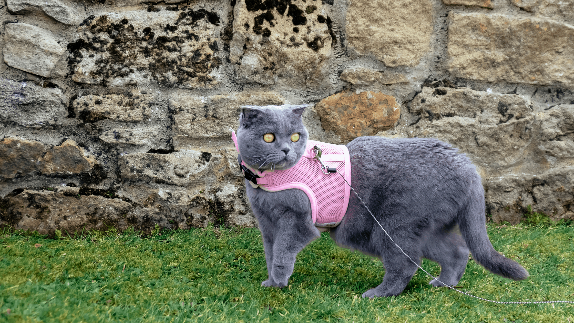 You want the fabric of the harness to be lightweight and breathable. Remember your cat will be wearing this outside where there is a higher risk of overheating. A nice one made from cloth or nylon would work well. I’m partial to a step-in harness so I don’t have to put anything over their head but select what is comfy for you and your cat. Most harnesses come with a leash but if yours doesn’t make sure to get one as well.